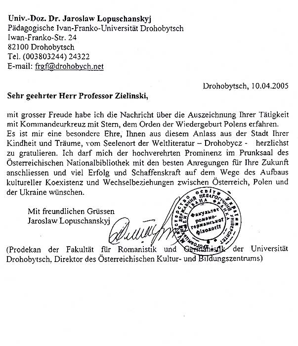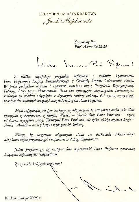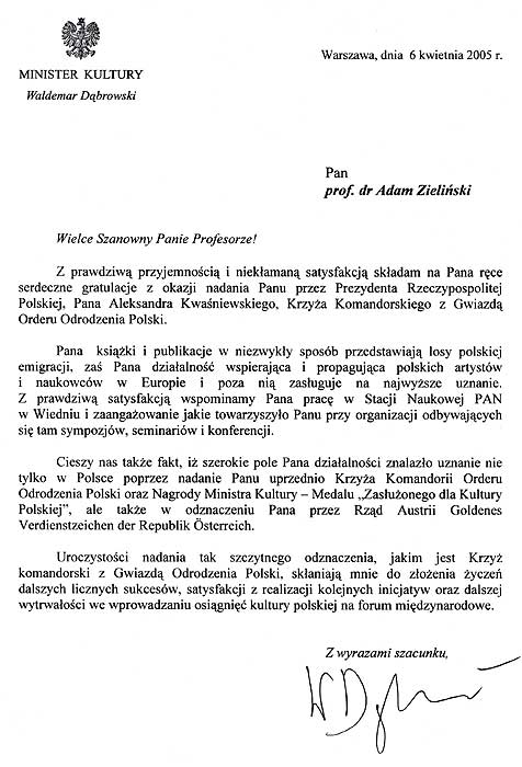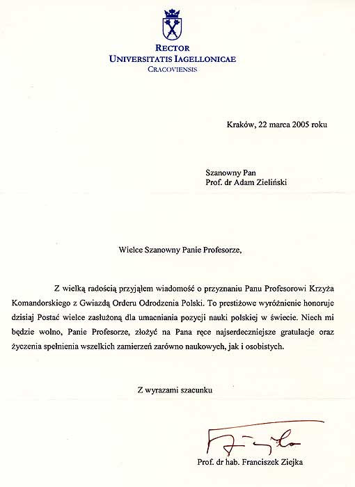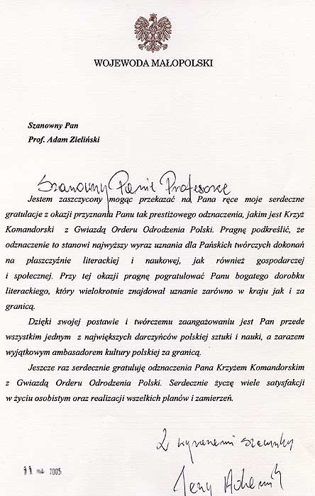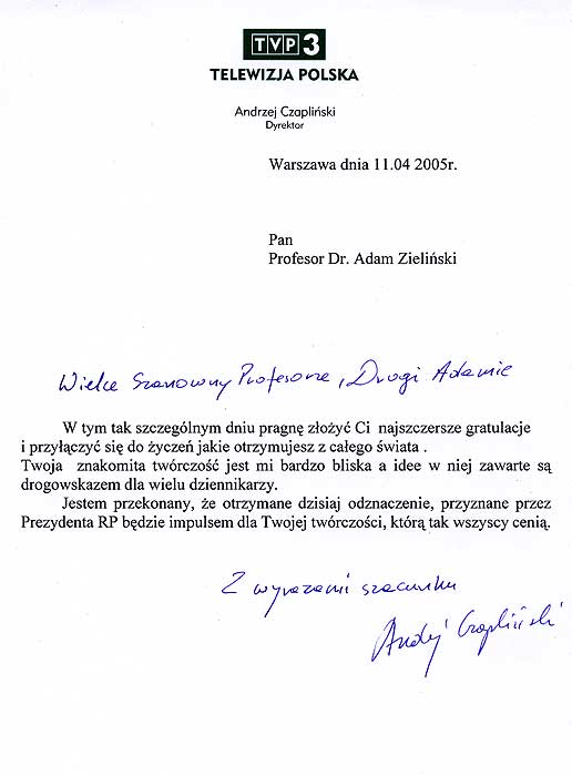 GRATULACYJNE Z OKAZJI NADANIA PRZEZ PREZYDENTA RP ALEKSANDRA