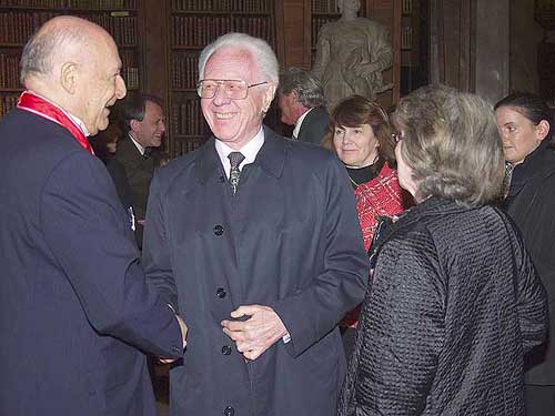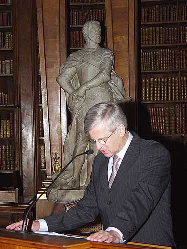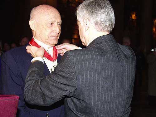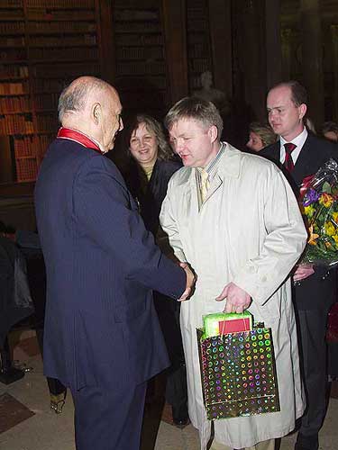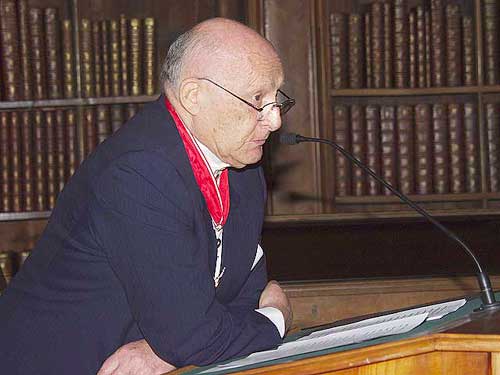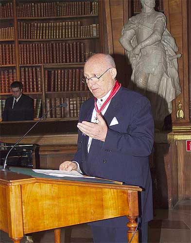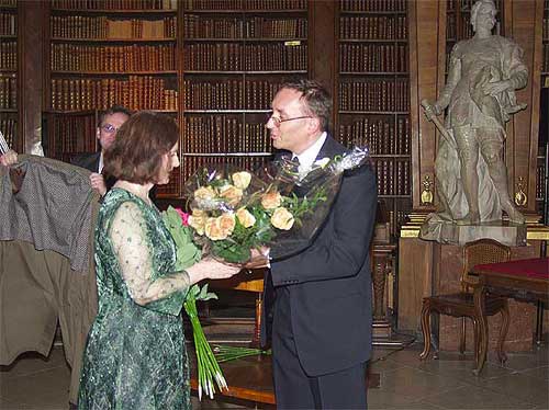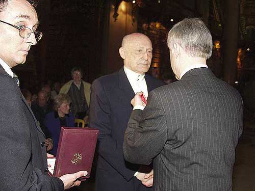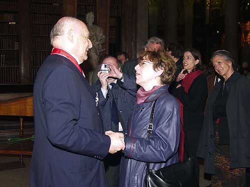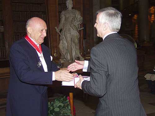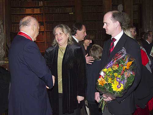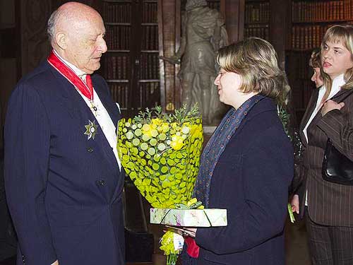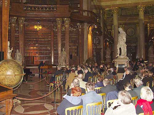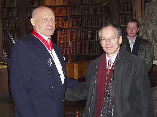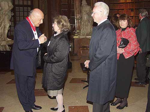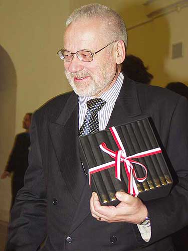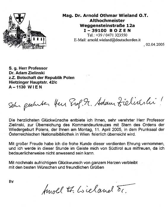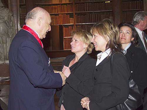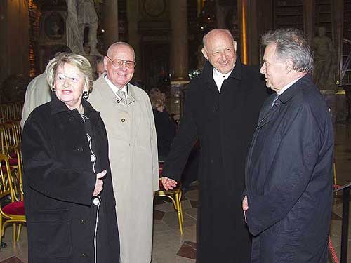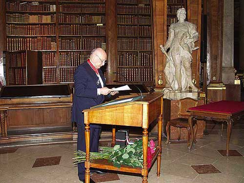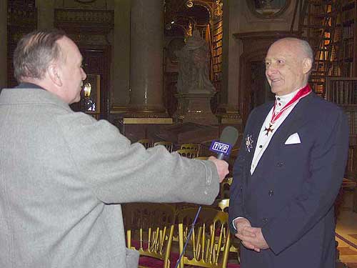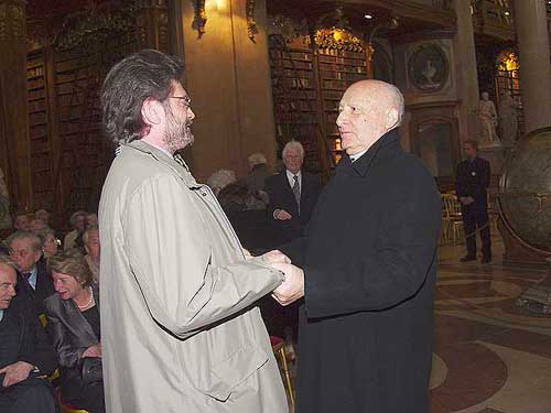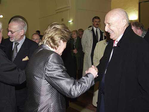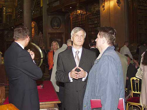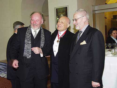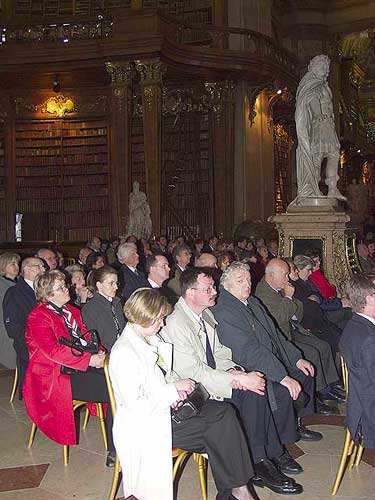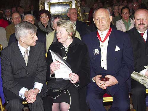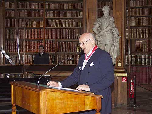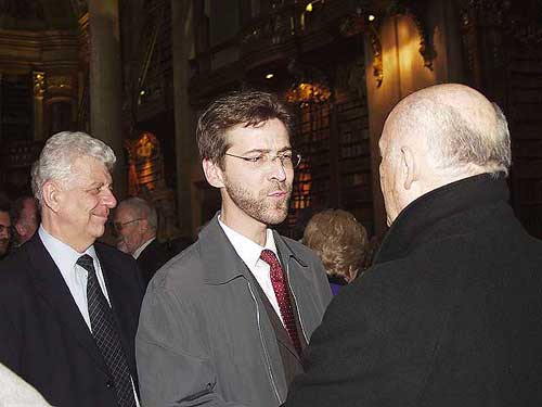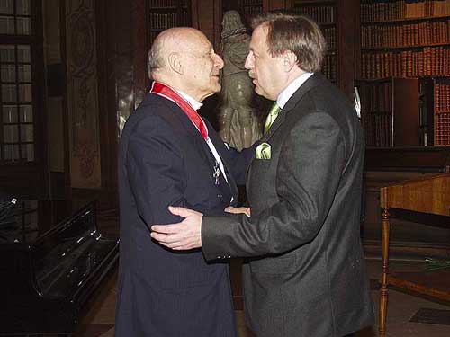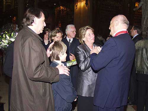 Ohne Übertreibung kann die Verleihung des Kommandeurkreuzes mit Stern des Ordens der Wiedergeburt Polens durch Botschafter Marek Jędrys an den polnisch-österreichischen Schriftsteller Adam Zieliński im Prunksaal der Österreichischen Nationalbibliothek als ein denkwürdiges und in seiner Weise einmaliges Ereignis in der Geschichte der polnisch-österreichischen Beziehungen angesehen werden. Vizekanzler a. D. Erhard Busek würdigte in seiner Laudatio den Ausgezeichneten als ein bestaunenswertes Phänomen und als politischen Literaten, in dessen Werk das gesamte 20. und 21. Jahrhundert mit seinen Leiden und Visionen Ausdruck gefunden habe. Adam Zieliński zeigte sich in seiner Dankesrede tief bewegt, dass ihn Polens Präsident Aleksander Kwaśniewski mit dem zweithöchsten Orden, den die Republik Polen zu vergeben hat, auszeichnete, und vergaß auch nicht, in ganz besonderer Weise seiner Gemahlin Sophie Zieliński zu danken. Stolz verwies er darauf, dass er, der Waisenknabe aus Galizien, von dessen Angehörigen viele von den Nazis umgebracht worden waren, entgegen jeglicher Geschichtslogik sich heute auf eine große Familie - sein Sohn Christoph Zieliński war mit Ehefrau Ricarda Reinisch und Sohn Leonard natürlich auch anwesend - stützen könne. Triebfeder seines Schreibens sei es immer gewesen, der Humanität und Toleranz eine Stimme zu geben. Die musikalischen Akzente der Feier setzten in kongenialer Weise die Geigerin Johanna Mądroszkiewicz und die Pianistin Elżbieta Wiedner-Ząjąc. |