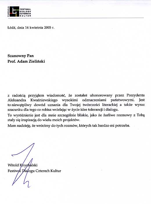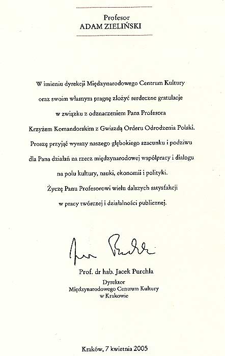 GRATULACYJNE Z OKAZJI NADANIA PRZEZ PREZYDENTA RP ALEKSANDRA KWAŚNIEWSKIEGO