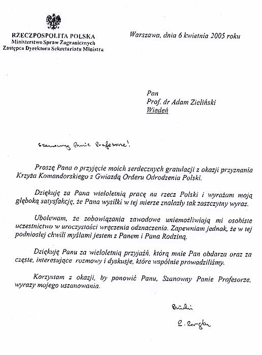 KOMMANDEURSKREUZ MIT STERN DES ORDENS DER WIEDERGEBURT POLENS FÜR PROF. DR. ADAM ZIELIŃSKI |