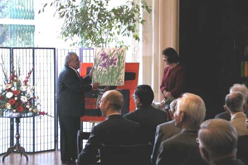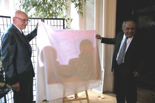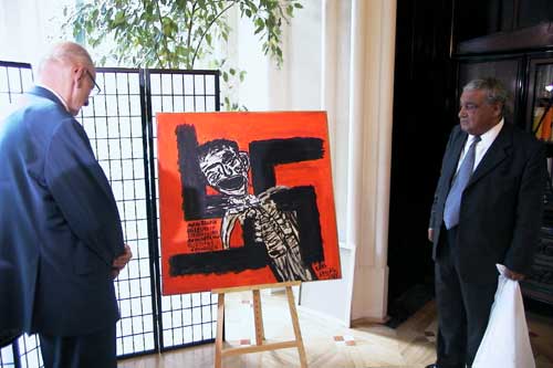 Bartoszewskiemu swój świeżo namalowany obraz - symbol pamięci o wszystkich pomordowanych